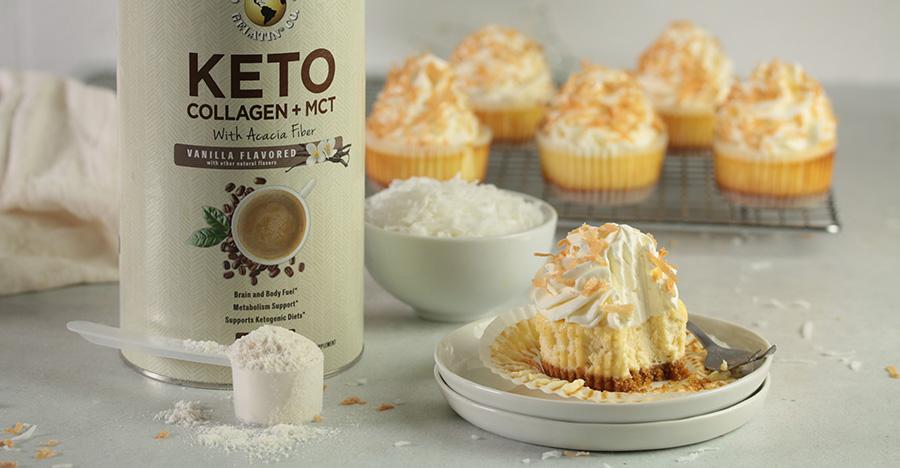 - Whip the cream and Vanilla KETO Collagen + MCT to firm peaks .